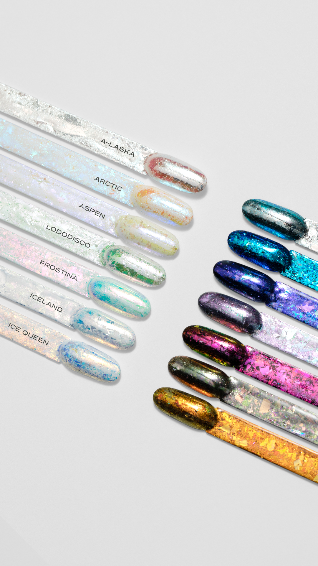 They work great as an addition to hybrid, gel nails and acrylic gels. They are suitable for application both on the sticky layer of a product, such as Gel Polish, and on products without an inhibitory layer, such as Tip Top Top Coat.